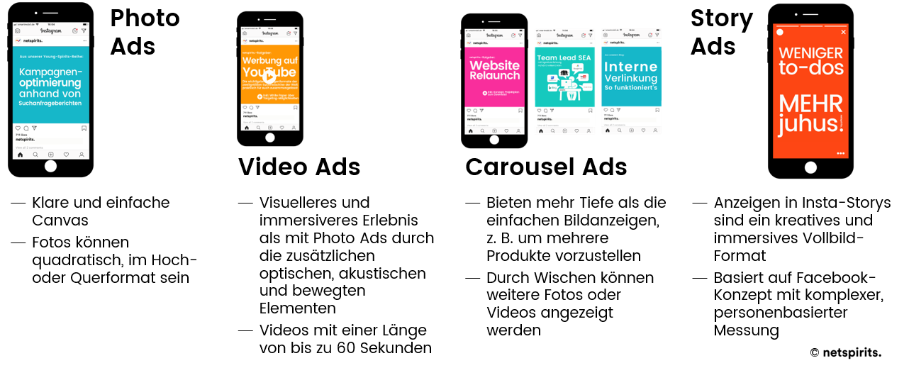 Mittlerweile sind die Unterschiede zwischen den verfügbaren Anzeigenformaten von Facebook und Instagram minimal und die beiden Werberiesen haben klare Vorgaben für die Erstellung der Anzeigen entwickelt. So gibt es neben Bild- natürlich auch Videoanzeigen; das von Facebook etablierte Carousel-Ad-Format ist längst von Instagram übernommen worden während Facebook sich das Story-Format von Instagram abgeguckt hat.